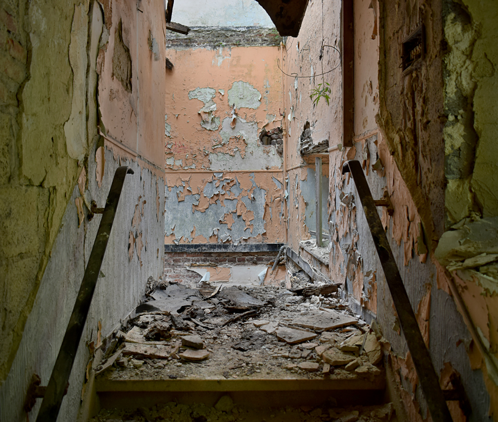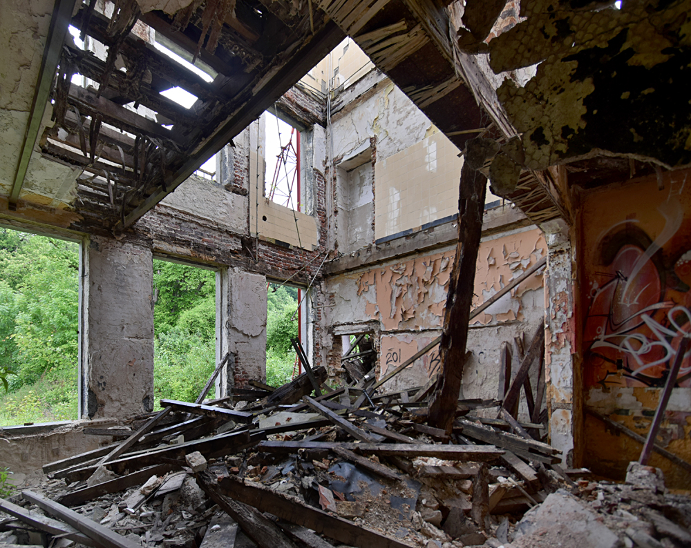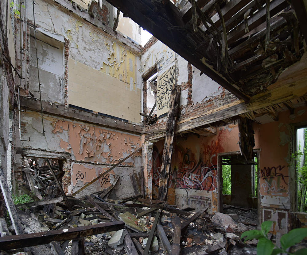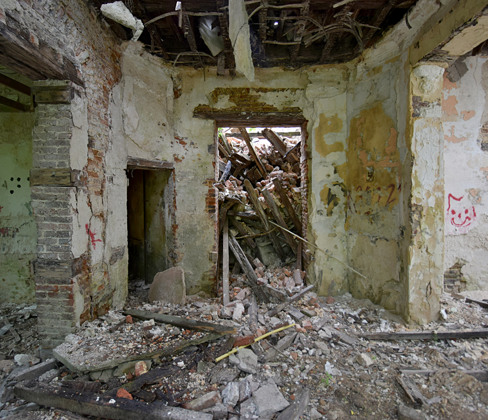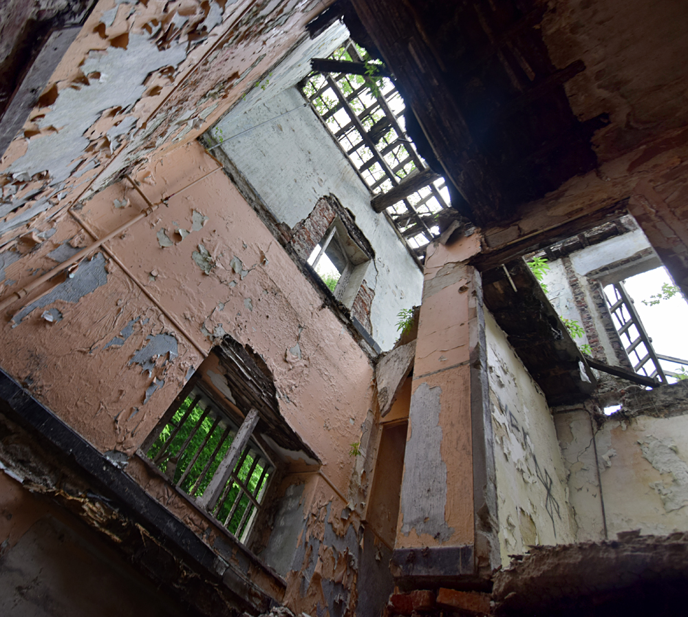 Depuis la carcasse du château un couloir permet de rejoindre un autre bâtiment qui devait probablement servir de communs et/ou de logement pour le personnel. Ici aussi, tout est en plus ou moins mauvais état, et la toiture a également pris cher. Comme dans de nombreux lieux à l’abandon, on croise des tags et des grafs ici et là. L’un d’eux attire mon attention. Plutôt réussi, il est malheureusement compliqué à voir en entier car la peinture sur lequel il a été peint s’est trop décollé. Ne restent que des détails vraiment beaux, comme ces bandelettes tenues par la main d’un personnage. D’autres bandelettes, jaunes, partent de son autre main. Curieuse vision sur laquelle s’achève ma visite (pédestre) du site. |