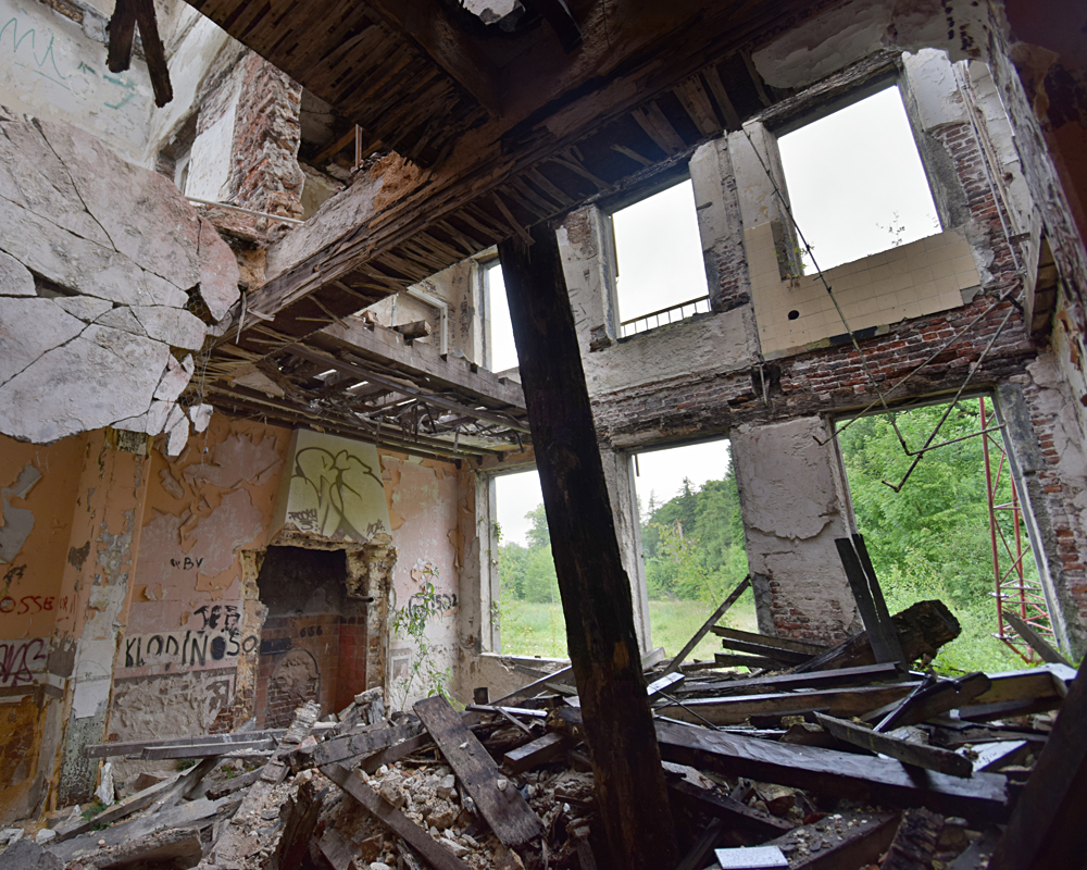 Aude décide de rester dans la voiture tandis que Guillaume et moi explorons le site. Et il faut bien reconnaitre que si le château avait une certaine classe quand il était en activité, en 2025 il n’est plus que l’ombre de lui-même. Probablement déjà ouvert aux quatre vents quelques années auparavant, sa situation ne s’est clairement pas améliorée depuis l’incendie : escaliers défoncés, planches effondrés, débris un peu partout… Je ne suis pas expert dans le domaine, mais une réhabilitation me semble compliquée. Ci-dessous des photos du bâtiment principal : |