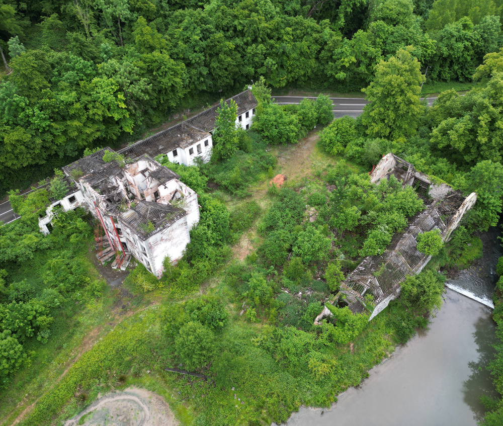 Une fois revenu à la voiture, je demande à Aude de me prêter son drone afin de voir à quoi tout ça ressemble d’en haut, les batteries du mien étant vides. Ci-dessous, le résultat de cette visite «aérienne». Sur la cinquième on remarque un bâtiment en bord de rivière. C’est un ancien moulin, lui aussi en ruines, que je n’ai pas jugé intéressant de visiter, la pluie se faisant un peu trop pressante à mon goût. |