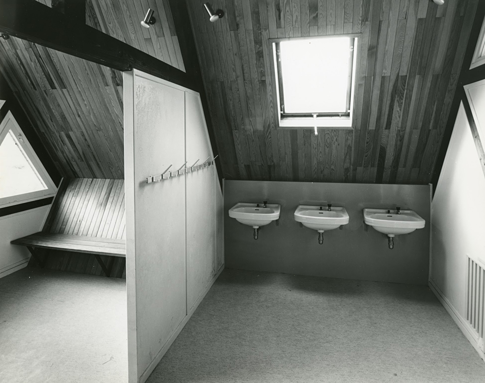 Quittant le curieux bâtiment rose bleu et jaune, direction l'ancien terrain de foot, complètement en friche. Jetant un rapide coup d'œil en arrière, je regarde les locaux techniques en forme de teepees aperçus en début de visite, puis entre dans un local technique lui aussi de forme triangulaire. Dedans, divers objets témoignent du passé enfantin du lieu. Si certains locaux vus en début de visite ont subi pas mal de dégradations, celui-ci est presque intact. Les toiles d'araignées sont probablement là depuis l'abandon, et personne n'y a encore touché. |