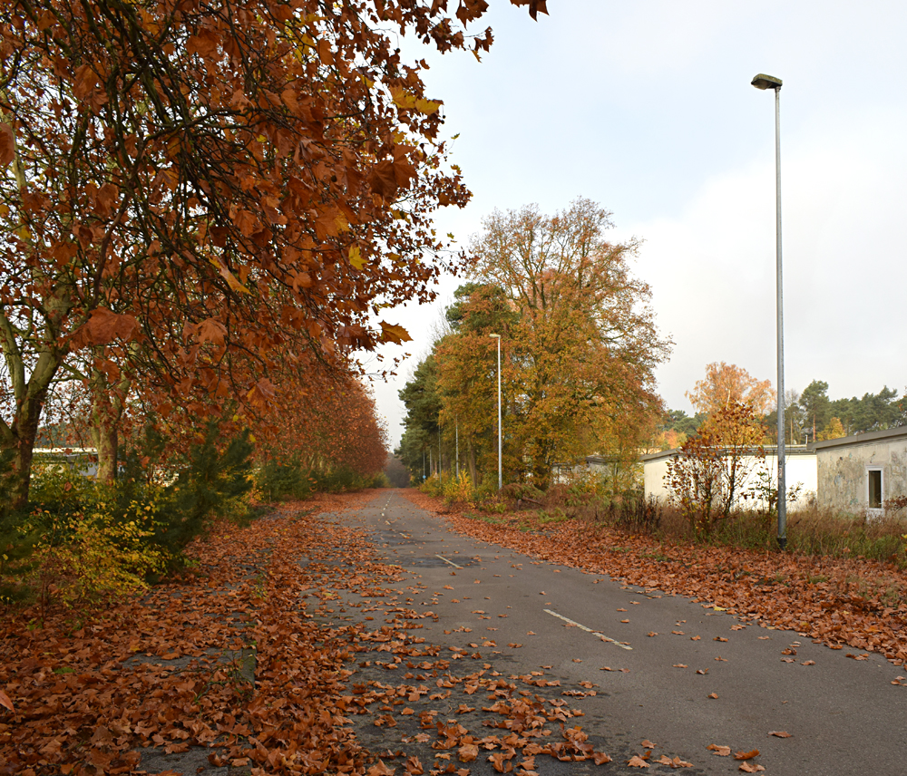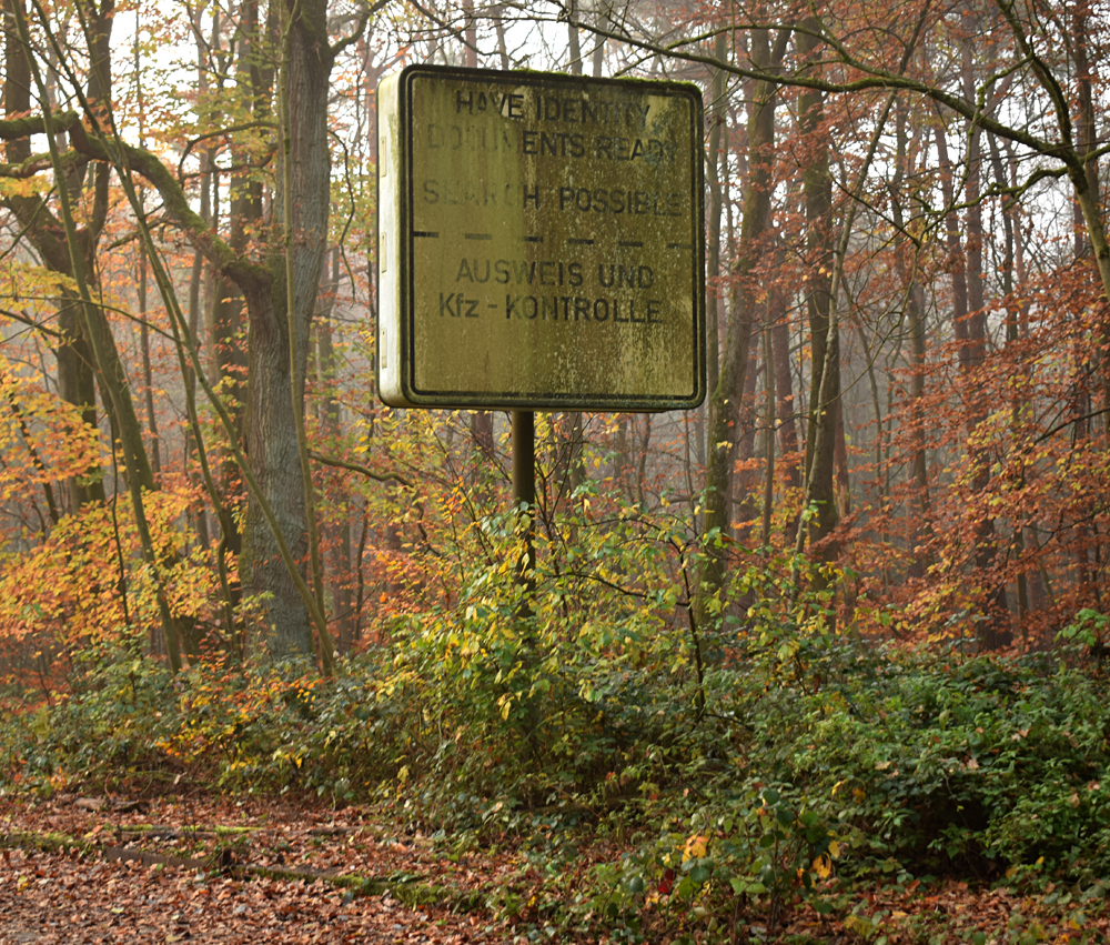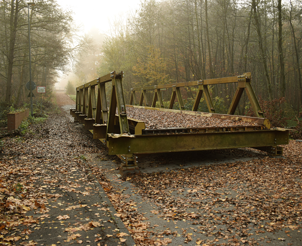 Après une belle nuit de repos, me voici tout à l’ouest de la base en compagnie d’Aude et Guillaume, mais pas Ubartho. Notre camarade vidéaste est ce matin à l’autre bout de la base, dans la zone pavillonnaire, à deux kilomètres de nous, pour faire des images au drone en vue de sa future vidéo. Nos plannings étant différents, il doit repartir d’ici une petite heure. De notre côté, nous avons décidé de passer la matinée dans l’ouest de la base avant de repartir au moment du déjeuner. Durant cette période nous nous restons évidemment en contact avec Ubartho, et cela portera ses fruits comme vous le verrez plus loin sur cette page. N’étant jamais entrés dans la base par l’ouest, c’est avec une certaine appréhension que nous progressons à pied le long d’une route tapissée de feuilles mortes. Une appréhension augmentée par le fait que nous savons que la Police s’entraine dans la partie ouest de la zone nord. Mais où exactement ? Ca, nous ne le savons pas vraiment... Quelques pas plus loin nous découvrons une passerelle métallique posée par-dessus la route car la rivière passant dessous a fragilisé le sol. Ce gros obstacle de métal est-il le signe qu’aucun véhicule ne passe ici et que cet accès est tranquille ? A priori oui, et nous voilà déjà un peu plus en confiance pour la suite. Avançant lentement, le portail de la base grandit au fur et à mesure de notre progression. Une fois face à lui, nous découvrons une clôture partant des deux côtés. L’objectif que nous voulons visiter est sur la gauche, mais nous décidons de prendre sur la droite pour d’abord documenter une petite zone à priori «facile à visiter» et clairement à l’abandon contrairement à l’autre objectif dont la situation semble un peu plus floue d’après nos repérages sur Google Maps. Marchant quelques secondes dans les feuilles mortes, nous constatons avec une certaine joie que la clôture s’arrête purement simplement au bout d’un dizaine de mètres. Ainsi, de la même manière que pour la zone pavillonnaire, il n’y a qu’à entrer sur le site ! Un peu trop facile ? C’est pourtant le cas. Ci-dessous, des photos de ce moment où le léger stress de devoir entrer dans la base se retrouve contrebalancé par le calme de cette forêt endormie, la sérénité de cette petite rivière et la mignonnerie des petits champignons croisés ici et là… |
