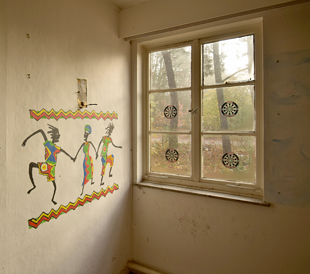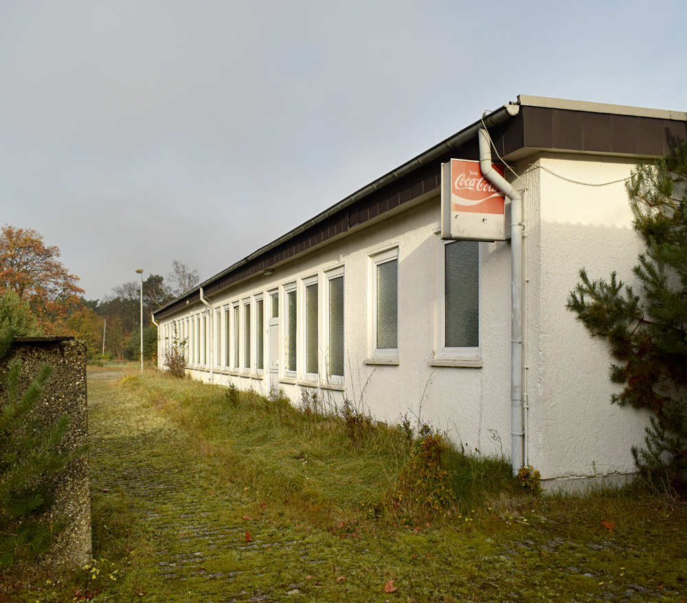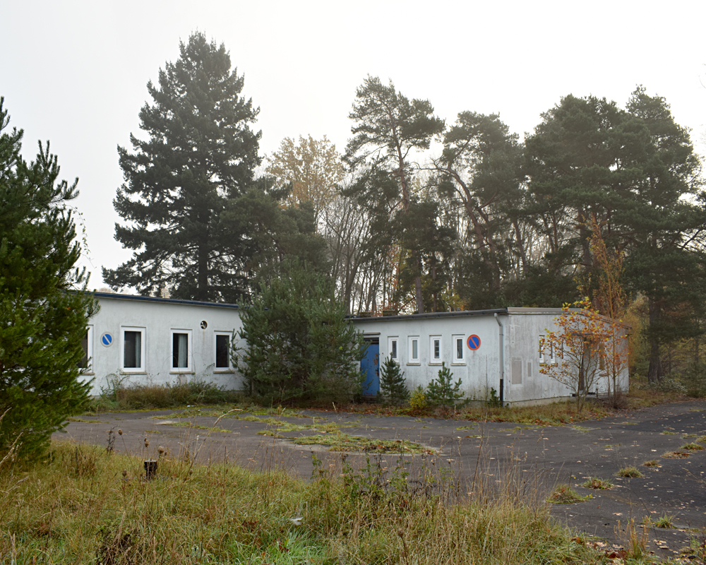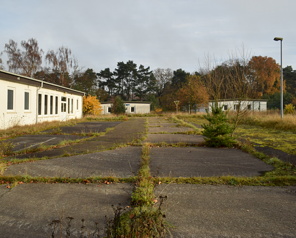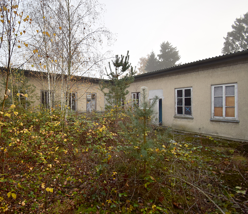 Une fois ressortis, nous nous dirigeons vers notre objectif de la matinée : la grande école située non loin d’ici. Traversant rapidement la grande route qui circule d’est en ouest au milieu de la base, nous découvrons une petite zone composée de différents bâtiments que nous ne visitons pas, préférant nous focaliser sur l’objectif. Mais, surprise, après avoir marché une petite dizaine de minutes à travers un petit bois offrant un parfait camouflage, nous découvrons trois véhicules garés devant l’école, dont un avec un joli «Police» écrit dessus ! Un peu déçus, nous rayons ce lieu de notre visite et revenons sur nos pas, direction la petite école vue plus tôt en arrivant sur place, pour faire un petit point sur la suite de la visite. |
