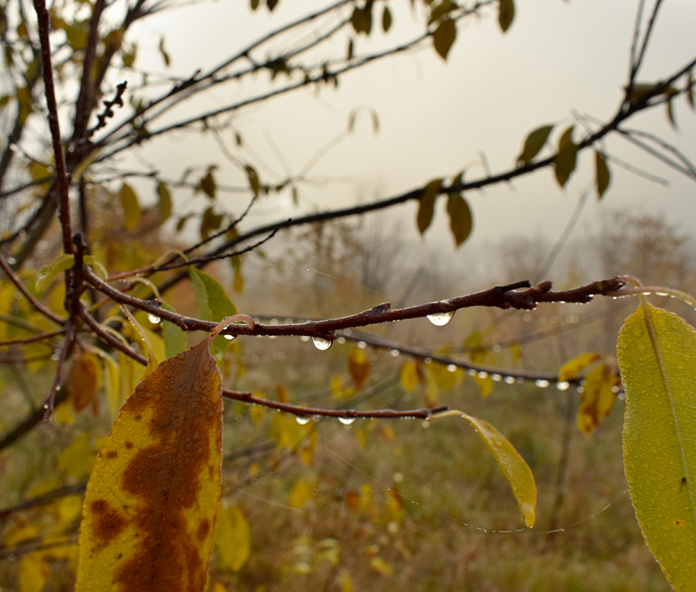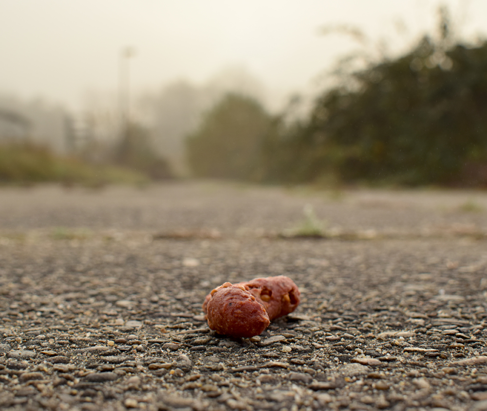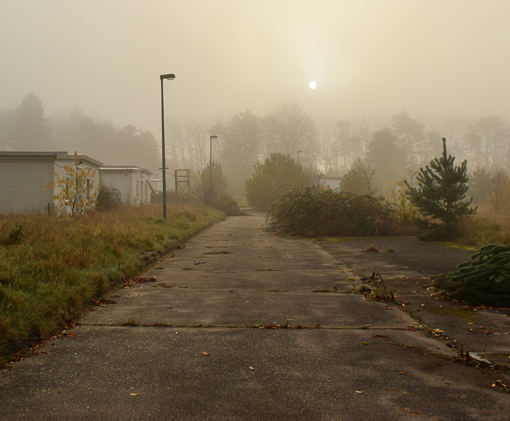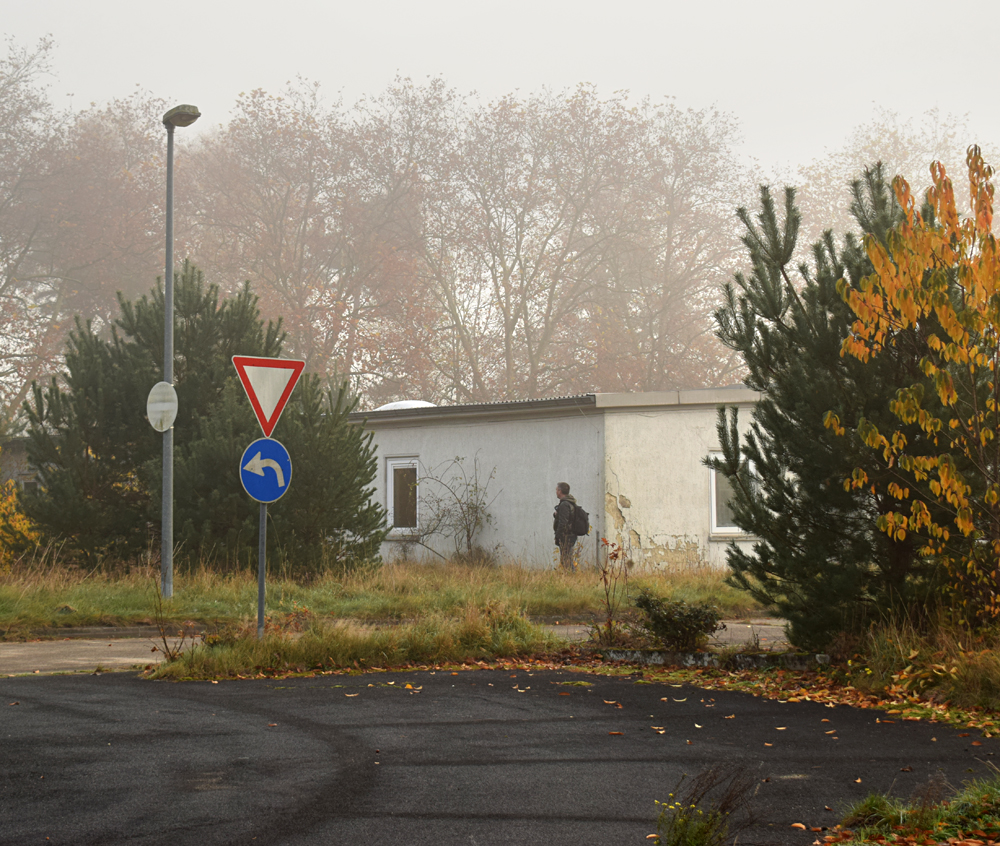 Sortant de la petite école, quelle belle surprise que cette brume partout ! Si la zone pavillonnaire avait un bel aspect de film postapocalyptique, c’est encore plus le cas ici. Qu’est-ce donc que cette curieuse structure à quelques mètres de nous ? On dirait bien un réservoir… Et ce champ constellé d’arbustes ? Tout simplement un terrain de sport, mais je mets au défi quiconque de jouer un match de foot ici ! Marchant un peu au hasard, j’essaye de documenter le mieux possible cette incroyable ambiance de bâtiments endormis embrumés, de gouttelettes un peu partout, et même une petite crotte rose au sol, petit cadeau laissé ici par un chevreuil ? Le même qu’hier ? |