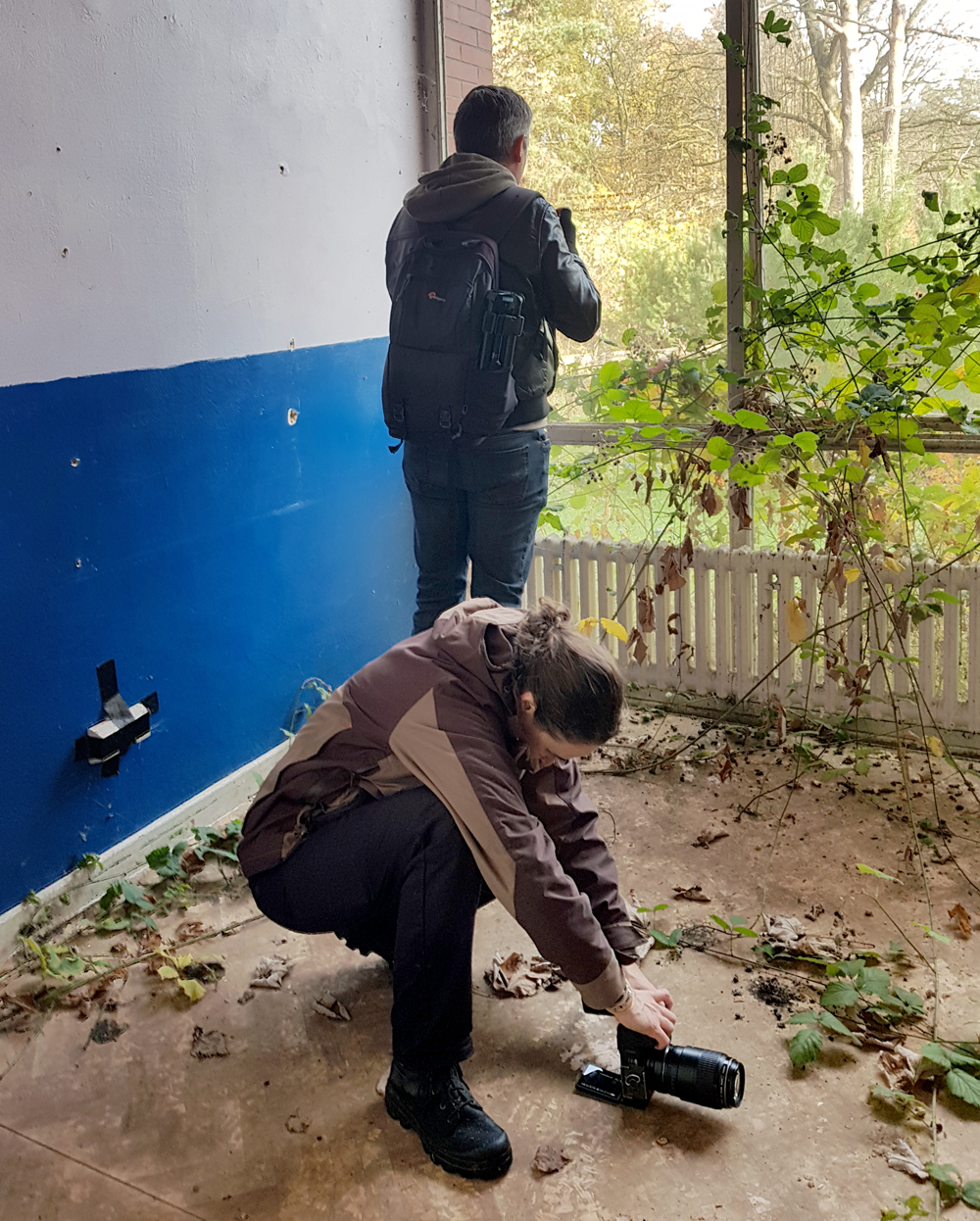 La scène étant si insolite, je motive Aude (qui a fini de prendre des photos avec son drone) à venir nous rejoindre pour faire des photos souvenirs. Durant ce moment, nous oublions complètement qu’une voiture de surveillance pourrait très bien débarquer et nous mettre dehors. Tant pis, nous profitons du moment, de la scène, de la belle lumière, de la sublime couleur de l’automne, de la chance que nous avons de nous trouver ici et d’avoir exploré quasiment tout ce que nous avions prévu d’explorer en venant ici pour la deuxième fois. |