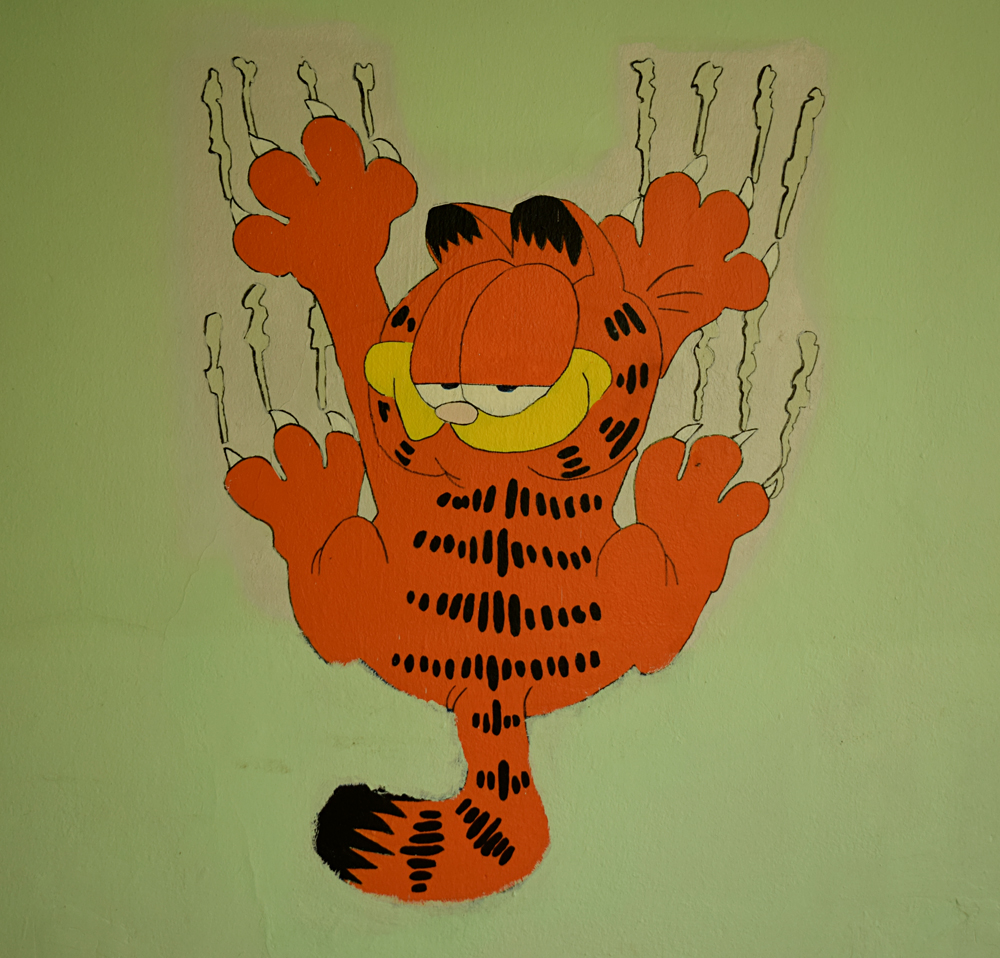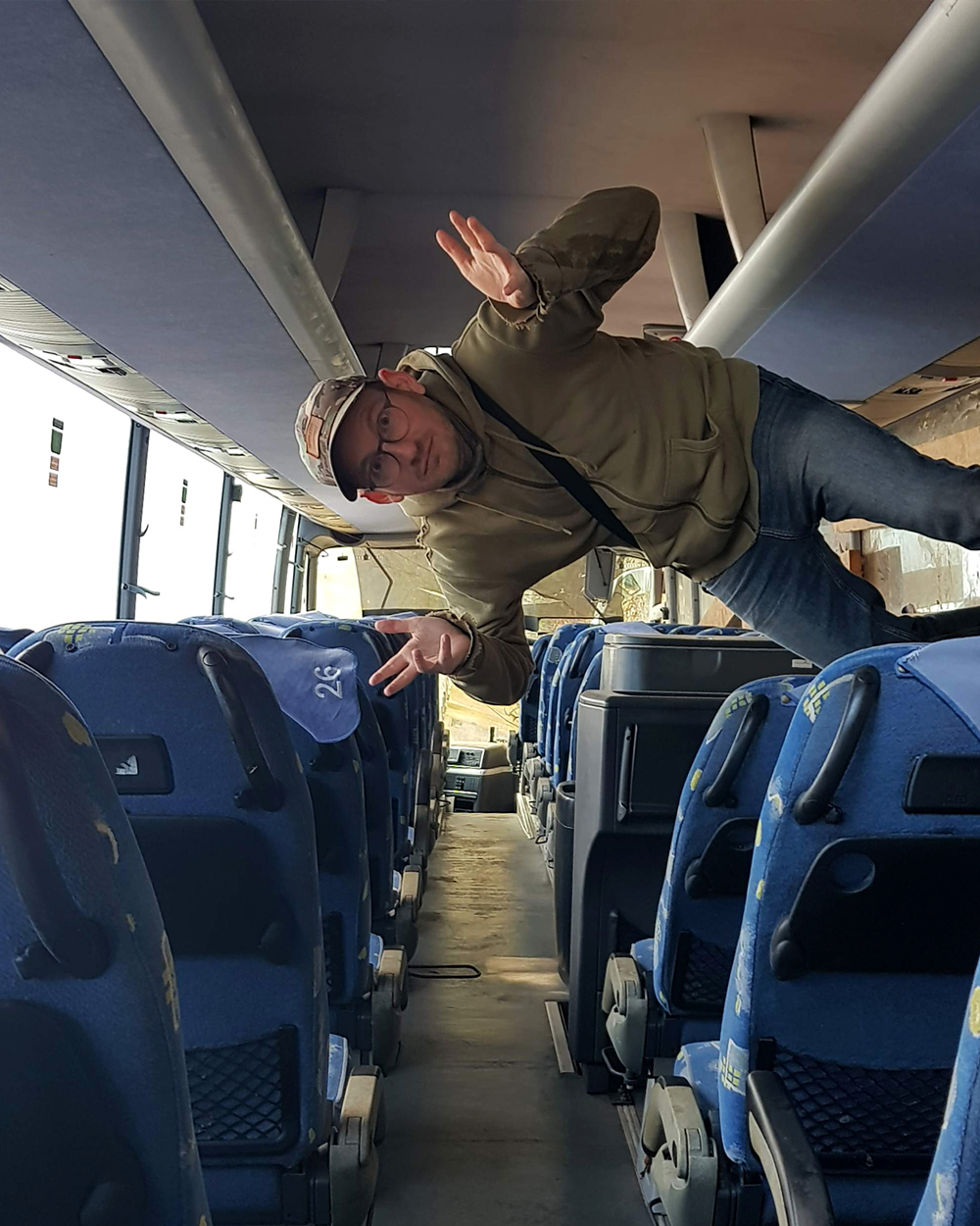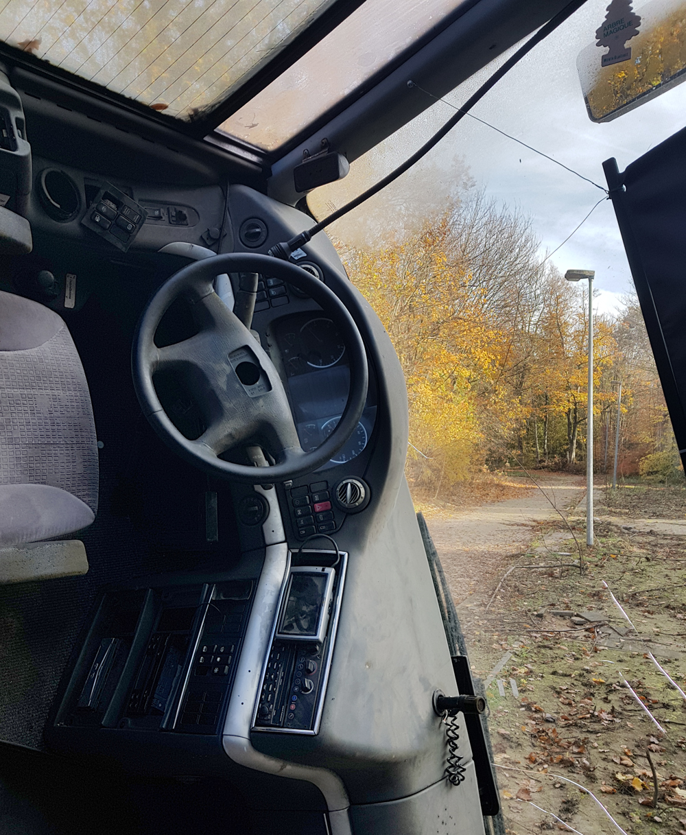 Après avoir fait deux fois le tour du bus, la curiosité me pousse à entrer dans le véhicule. A l’intérieur j’y découvre des planches de bois installés pour mieux y circuler. Je tombe aussi sur un morceau de tissus imbibé de liquide magenta. La piste du faux accident de la route semble se confirmer. Quelle curieuse ambiance que d’explorer un bus lorsque celui est presque entièrement couché sur le flanc ! Je donnerai cher pour avoir été là le jour où on a fait basculé le véhicule, le bruit de sa chute sur les parebrises des deux pauvres voitures a du être mémorable. |