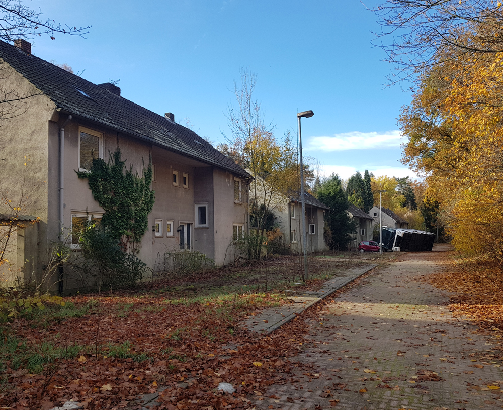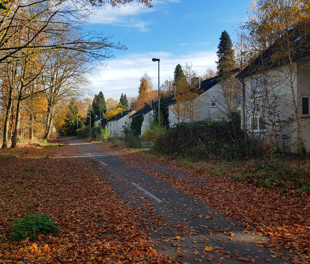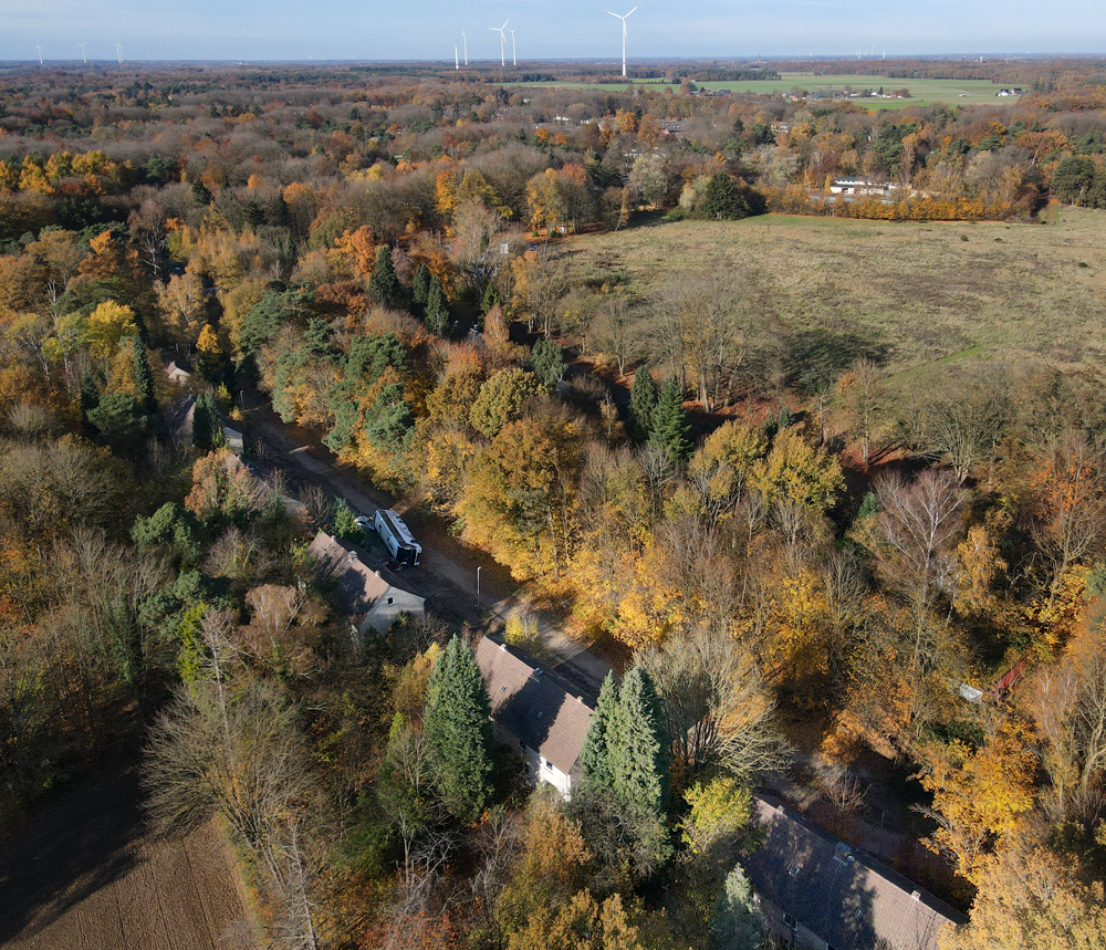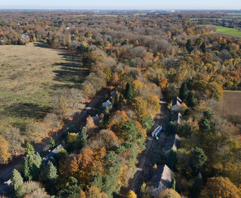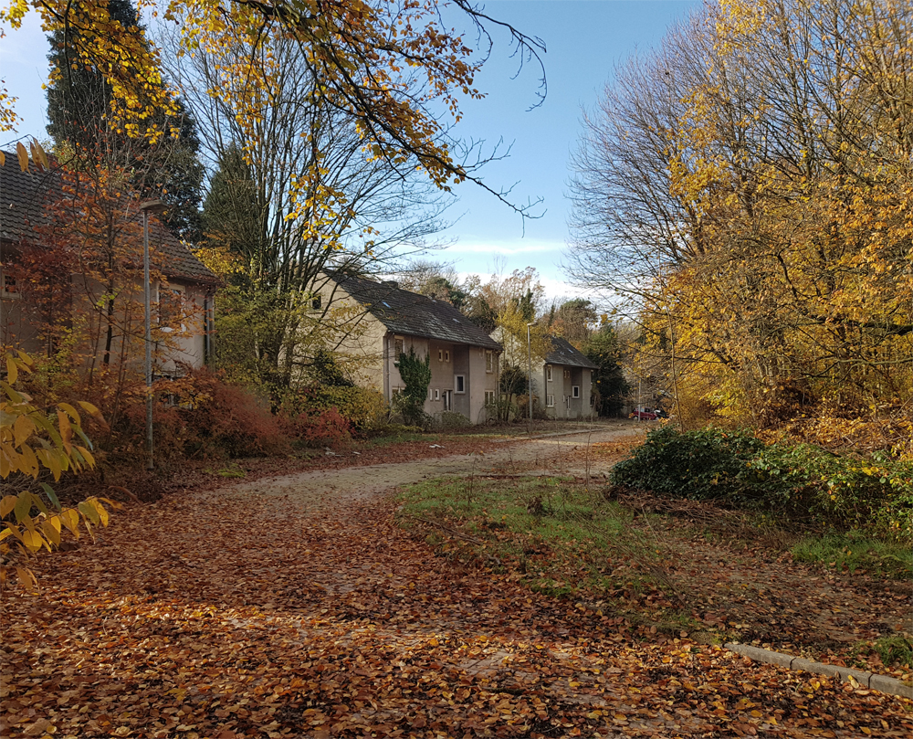 Revenant sur nos pas, nous quittons la base, retrouvons la route tapissée de feuilles mortes et la passerelle métallique surplombant la petite rivière. Direction la voiture garée non loin de là, et en route pour la zone pavillonnaire ! Une dizaine de minutes plus tard, nous retrouvons Ubartho (qui a fini ses images au drone), lui souhaitons bonne route, puis nous dirigeons vers l’endroit où Ubartho a pris des images avec son drone. Ce moment est l’occasion de découvrir un point d’accès encore plus simple que celui utilisé la veille. Ainsi, en quelques minutes nous nous retrouvons sur place. Ayant laissé mon appareil photo dans la voiture, je documente ce qui suit avec mon téléphone, et plus tard au drone. |