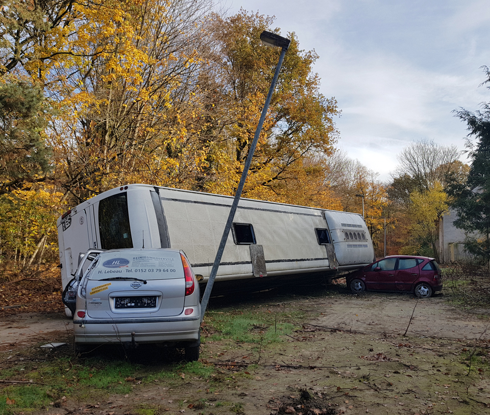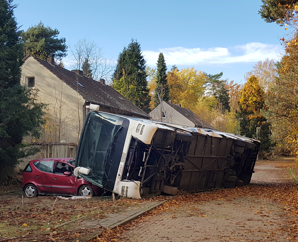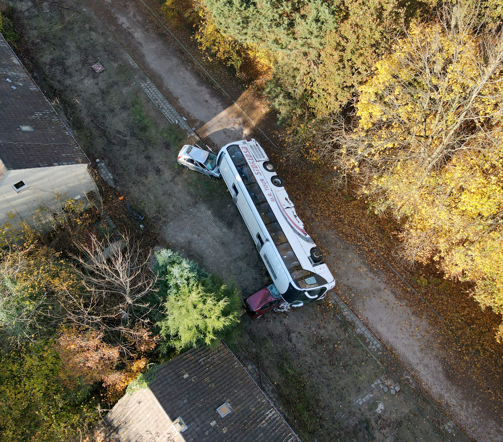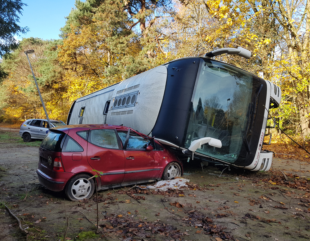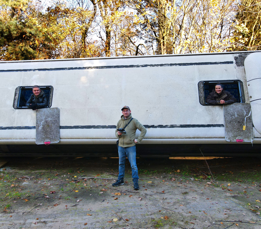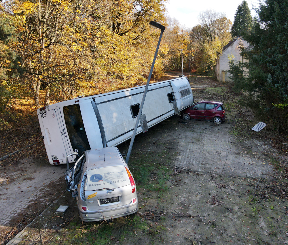 Les véhicules que nous avions vus de loin la veille étaient donc un bus et deux voitures, mais pourquoi ce bus est-il couché sur le côté, en train d’écraser les deux voitures ? Si le pourquoi du comment de cette installation nous rend perplexes, nous sommes surtout fascinés par le caractère photogénique de la scène : est-ce un accident mis en scène pour un film, un téléfilm, un clip ou autre ? Etant donné que la Police s’entraine sur place, est-ce qu’ils ont installés les véhicules ici pour reconstituer une scène d’accident ? Si oui, pourquoi à cet endroit de la base, à deux kilomètres de l’école où nous avons vu garés des véhicules de Police ? Déambulant avec Guillaume autour du bus, les questions s’empilent les unes par-dessus les autres, tandis qu’Aude survole le tout avec son drone… |