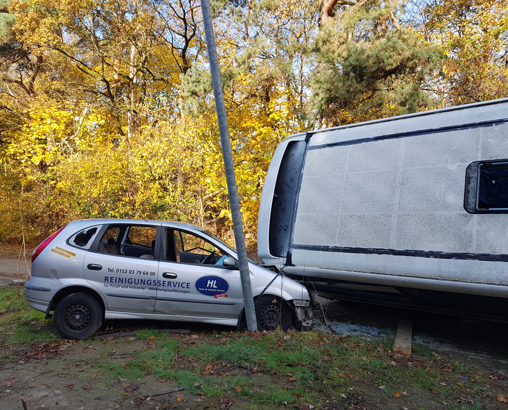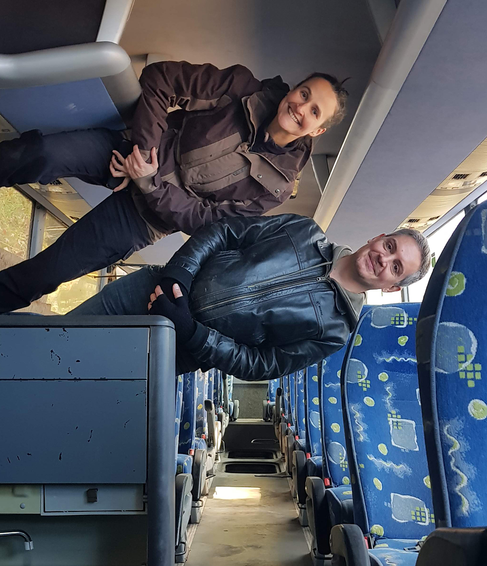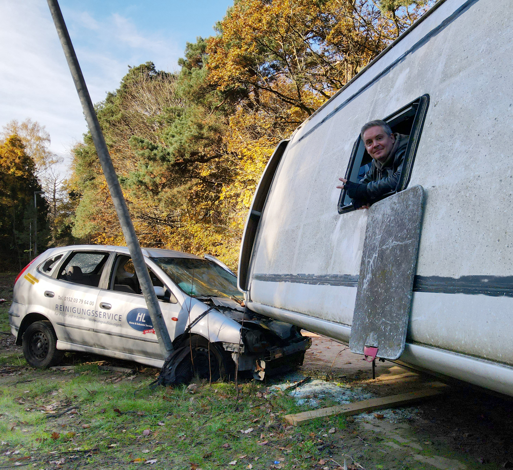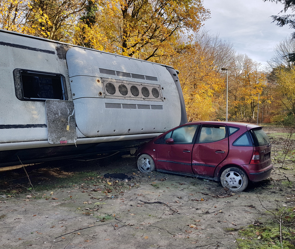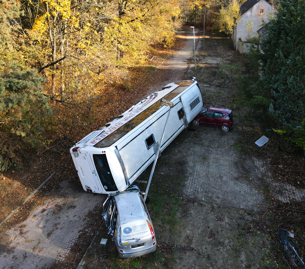 Les véhicules que nous avions vus de loin la veille étaient donc un bus et deux voitures, mais pourquoi ce bus est-il couché sur le côté, en train d’écraser les deux voitures ? Si le pourquoi du comment de cette installation nous rend perplexes, nous sommes surtout fascinés par le caractère photogénique de la scène : est-ce un accident mis en scène pour un film, un téléfilm, un clip ou autre ? Etant donné que la Police s’entraine sur place, est-ce qu’ils ont installés les véhicules ici pour reconstituer une scène d’accident ? Si oui, pourquoi à cet endroit de la base, à deux kilomètres de l’école où nous avons vu garés des véhicules de Police ? Déambulant avec Guillaume autour du bus, les questions s’empilent les unes par-dessus les autres, tandis qu’Aude survole le tout avec son drone… |
