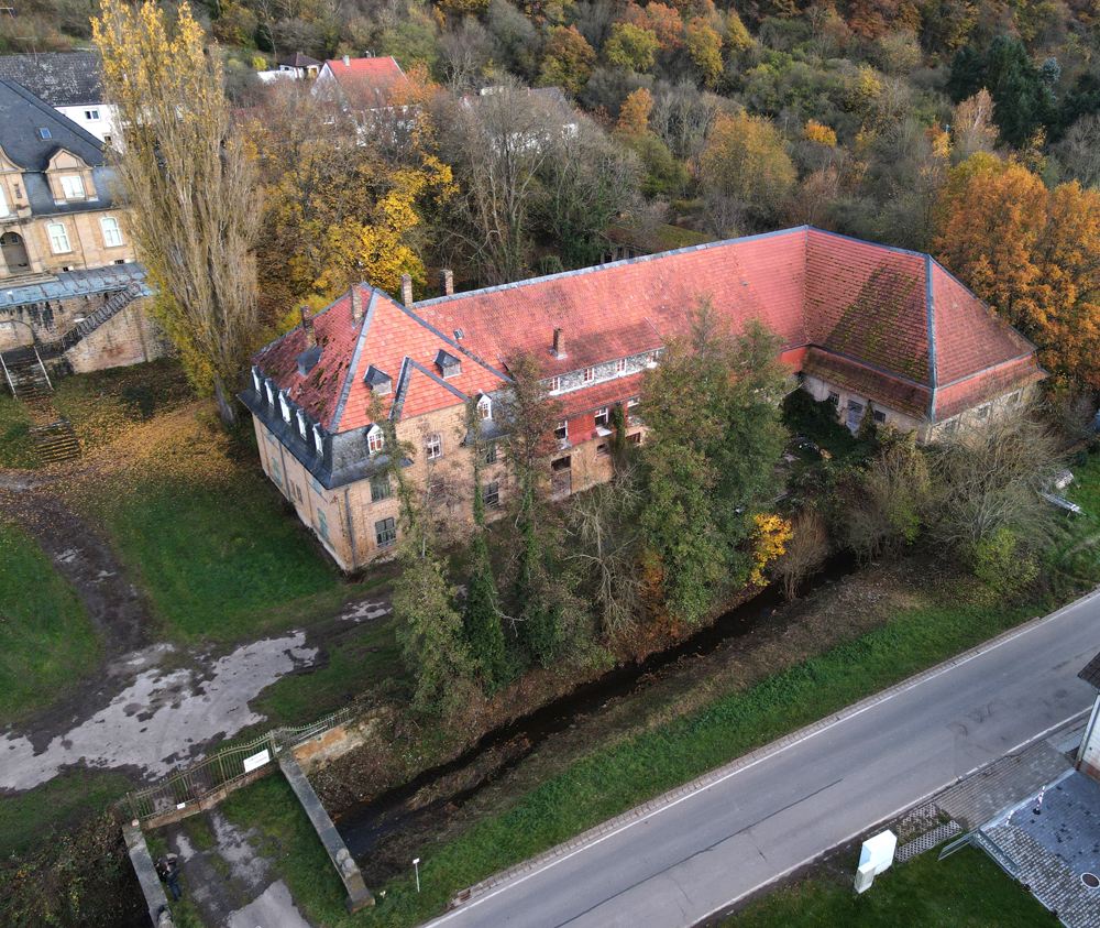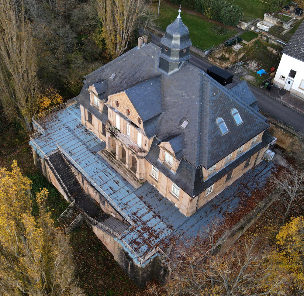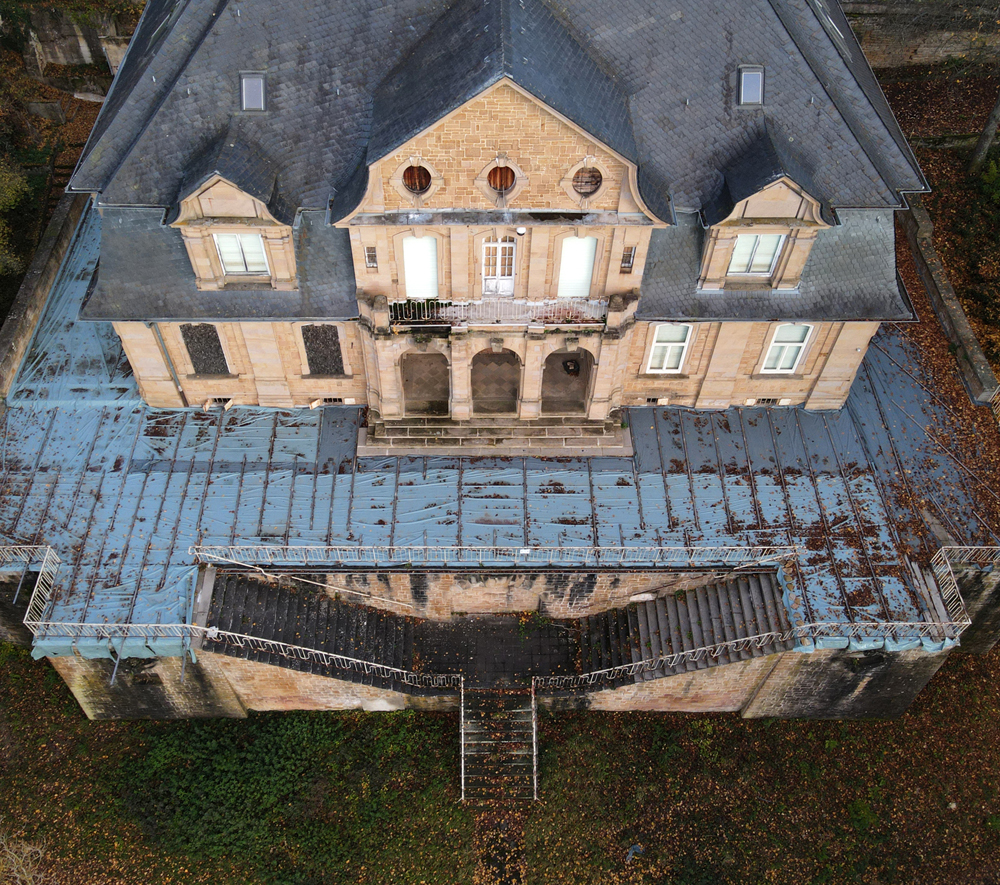 L’exploration urbaine c’est quelque fois venir visiter un lieu à l’abandon et constater que celui-ci a entretemps été rénové. C’est le cas pour celui présenté sur cette page. Repéré lors d’un road trip avec Aude et Guillaume, nous n’étions pas certains à 1000% que le lieu serait visitable. Quelques informations parlaient d’une rénovation, mais, comme souvent, le temps et l’argent font que les travaux mettent du temps à démarrer. Nous nous disions donc que nous pourrions peut-être documenter le lieu en attendant qu’il revive. Mais en arrivant sur place, les caméras et la propreté du site ne laissent aucun doute : rénovation ! Comme d’habitude, tant pois pour nous, mais tant mieux pour le lieu ! Situé à la sortie d’un petit village,, nous avons demandé aux gens habitant en face si cela ne les dérangeait pas que nous prenions des photos, à l’appareil ou au drone. Constatant que cela ne posait aucune gêne, nous avons donc immortalisé ce que nous pouvions, en commençant par une photo montrant l’arrière du bâtiment : |